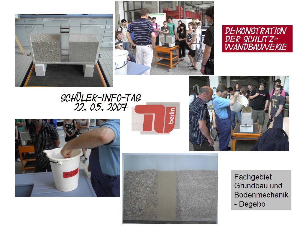 Demonstration der Schlitzwandbauweise beim Schüler-Infotag der TU Berlin am 22.05.2007 im Fachgebiet Grundbau und Bodenmechanik - Degebo (Vorführende: Dipl.-Ing. Daniel Aubram, Günter Körner, Harald Podeswa). |